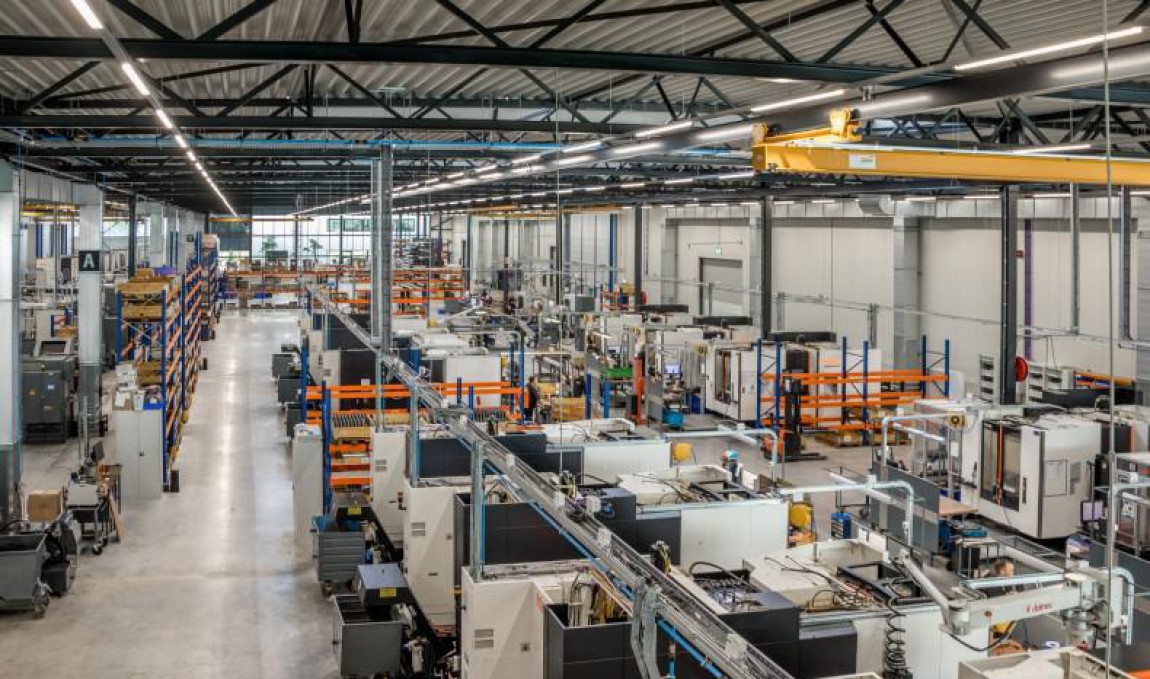 De draagconstructie vereiste veel maatwerk door de brede hal overspanning, “zwevende” uitkragingen, overkappingen en kraanbanen. Met vakmanschap geproduceerd in onze vestiging Nijverdal.
