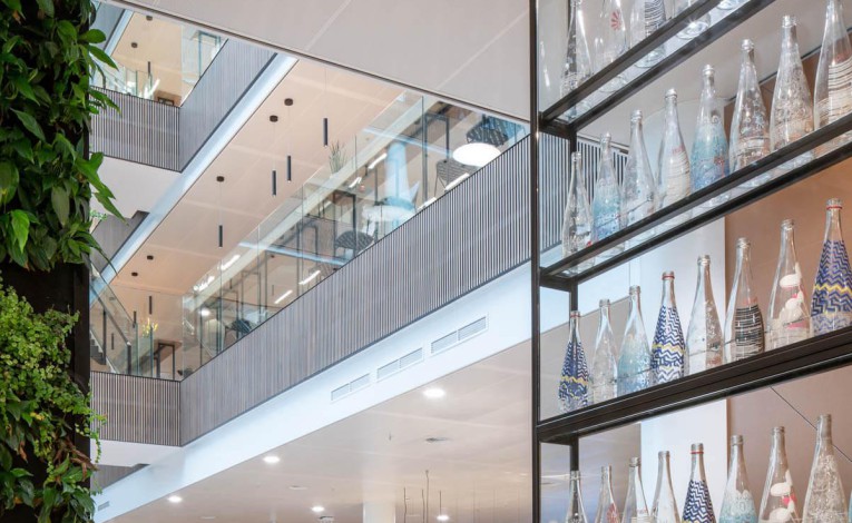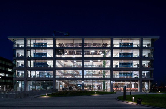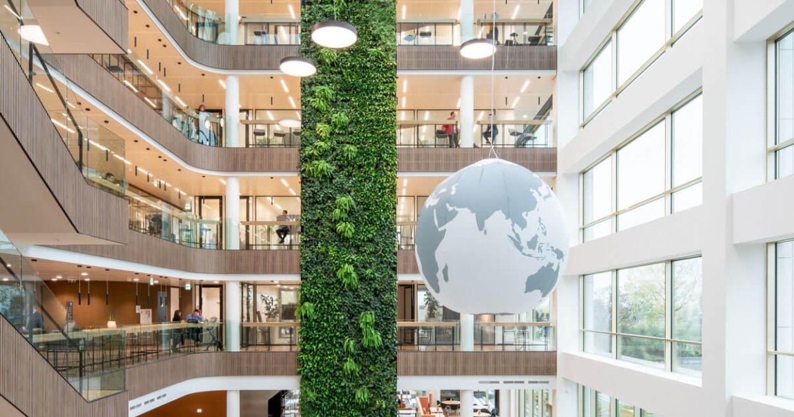 Het kantoor is ontworpen rondom een groot en licht atrium aan de tuinzijde. De blikvanger is een twintig meter hoge groene wand, volledig begroeid met planten. Deze groene wand brengt daglicht, lucht en natuur diep het gebouw in en draagt bij aan een gezond binnenklimaat.