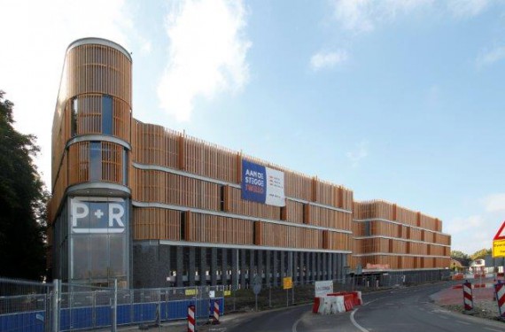 De parkeergarage heeft een compacte, vijflaagse opzet met een logische route voor auto’s en voetgangers. Houten lamellen en groene gevels zorgen voor veel daglicht, natuurlijke ventilatie en een vriendelijk aanzicht vanaf het station en de omliggende wegen. Binnen ervaren gebruikers een overzichtelijke, veilige parkeervoorziening met korte loopafstanden naar de perrons.